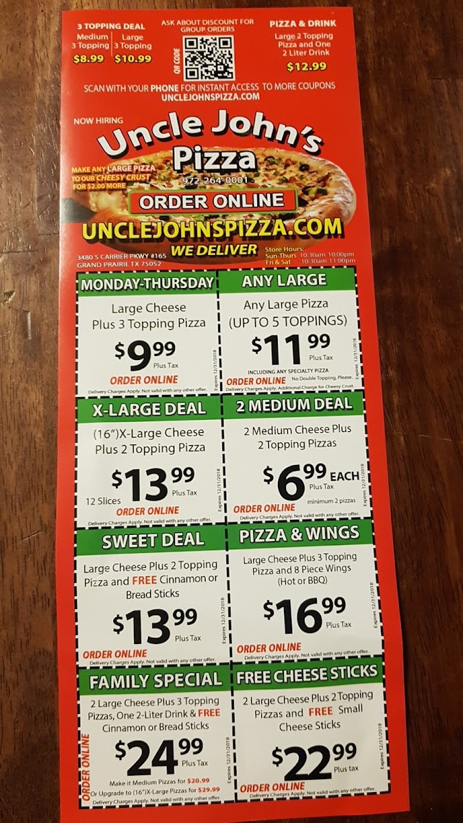 Welcome to Uncle John's Pizza, your new go-to spot for delicious, hearty pizza in Grand Prairie, Texas. Conveniently located at 3480 S Carrier Pkwy, this take-out only establishment is winning hearts with its flavorful creations and no-frills service.